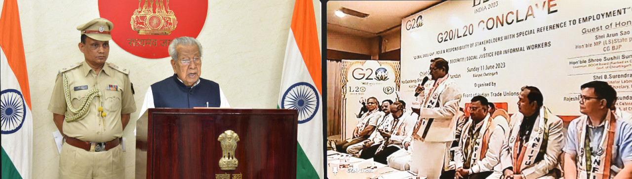 भारतीय मजदूर संघ (बीएमएस) के सहयोग से नेशनल फ्रंट ऑफ इंडियन ट्रेड यूनियन (एनएफआईटीयू) द्वारा आयोजित जी-20 लेबर 20 कॉन्क्लेव में राज्यपाल ने कहा कि छत्तीसगढ़ के लिए यह बहुत खुशी की बात है कि वैश्विक चिंता के श्रमिक मुद्दों पर चर्चा करने के लिए यहां प्रतिष्ठित विश्वविद्यालयों, उद्योगों, सरकारी संगठनों, ट्रेड यूनियन संगठनों, एनजीओ और विभिन्न क्षेत्रों के विशेषज्ञों की प्रतिष्ठित हस्तियां शामिल हुई है। उन्होंने कहा कि इस सम्मेलन में विचार विमर्श के बाद आये सुझाव, अंतिम जी-20 शिखर सम्मेलन के लिए सार्थक सिद्ध होंगे। उन्होंने विश्वास व्यक्त किया कि यह जी-20 कॉन्क्लेव वैश्विक चिंता के श्रम संबंधी मुद्दों के लिए मील का पत्थर साबित होगा और इससे हमारे श्रम बल को लाभ होगा।राज्यपाल ने कहा कि छत्तीसगढ़ राज्य को ‘‘चावल का कटोरा‘‘ के रूप में जाना जाता है, भारत के खनिज समृद्ध राज्यों में से एक है, जिसमें प्रचुर मात्रा में वन संसाधन, पर्याप्त श्रम शक्ति और अच्छी जलवायु है। आज बेरोजगारी, सामाजिक सुरक्षा और सामाजिक न्याय की समस्या हम सबके लिए चिंता का विषय है। बेरोजगारी हमारे समाज के विभिन्न सामाजिक मुद्दों का मूल कारण है।उन्होंने इस आयोजन की सफलता के लिए एनएफआईटीयू के पदाधिकारियों को बधाई दी। इस अवसर पर लेबर 20 कॉन्क्लेव के संयोजक डॉ. दीपक जायसवाल, गुरू घासीदास केंद्रीय विश्वविद्यालय बिलासपुर के कुलपति डॉ. आलोक चक्रवाल सहित राज्य गौ सेवा आयोग के अध्यक्ष  महंत रामसुंदर दास, छत्तीसगढ़ राज्य भवन एवं अन्य सन्ननिर्माण मंडल के अध्यक्ष सन्नी अग्रवाल , अन्य श्रमिक संगठनों के पदाधिकारी एवं विशेषज्ञ उपस्थित थे।